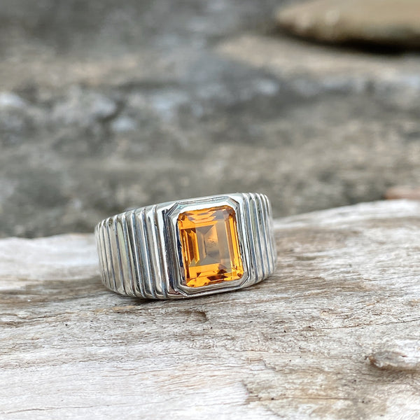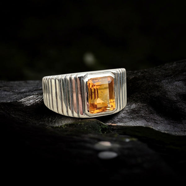 This bold men’s ring is crafted from solid S925 sterling silver, featuring a strong and confident design with deep grooves along the band. The centerpiece is a natural 8×10 mm emerald-cut Citrine, glowing with warm golden light — the birthstone of November, symbolizing success, abundance, and confidence.