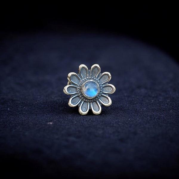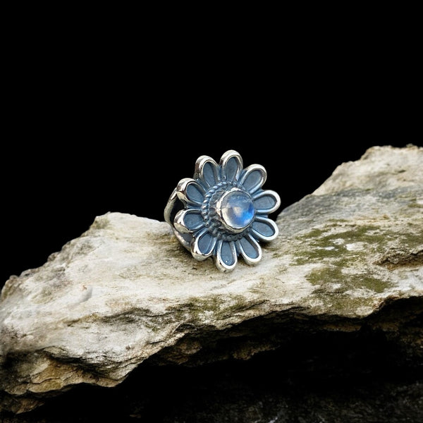 This elegant daisy charm is handcrafted from solid S925 sterling silver, featuring a full-petal daisy design. At the heart of the flower lies a high-quality natural moonstone (4mm), known for its mesmerizing blue flashes that shift beautifully under light.