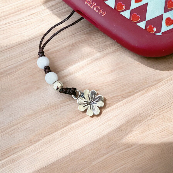 A minimalist lucky phone charm featuring a four-leaf clover design, highlighted with a sparkling moissanite stone on one petal.